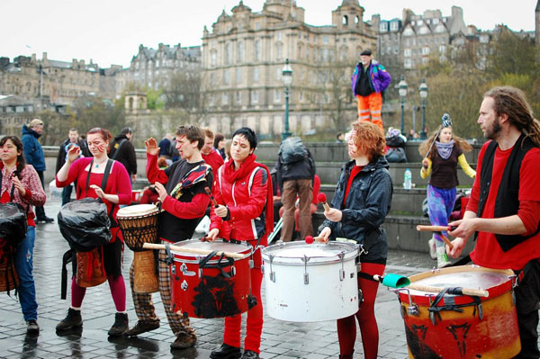 We prefers organic drums such as djembes, surdus, dharbukas and shakers, contrasting and complementing the snares, toms and kick drums of the more orderly and serious Processional Drummers.