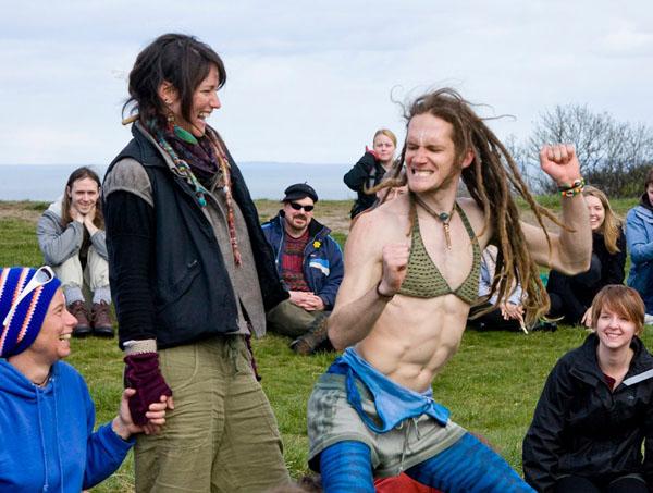 When the Horned God (the Winter aspect of the Green Man) sees the May Queen in her Maiden form, he realises that to be with the woman he loves he will need to undergo a huge change. As they process together around the hill, he prepares to surrender his life to her. She then gives him life energy and brings him back in his new form, as the Green Man, so they can be together.
