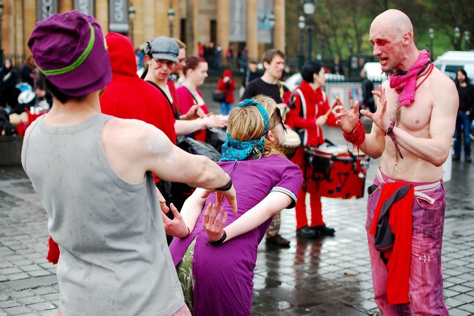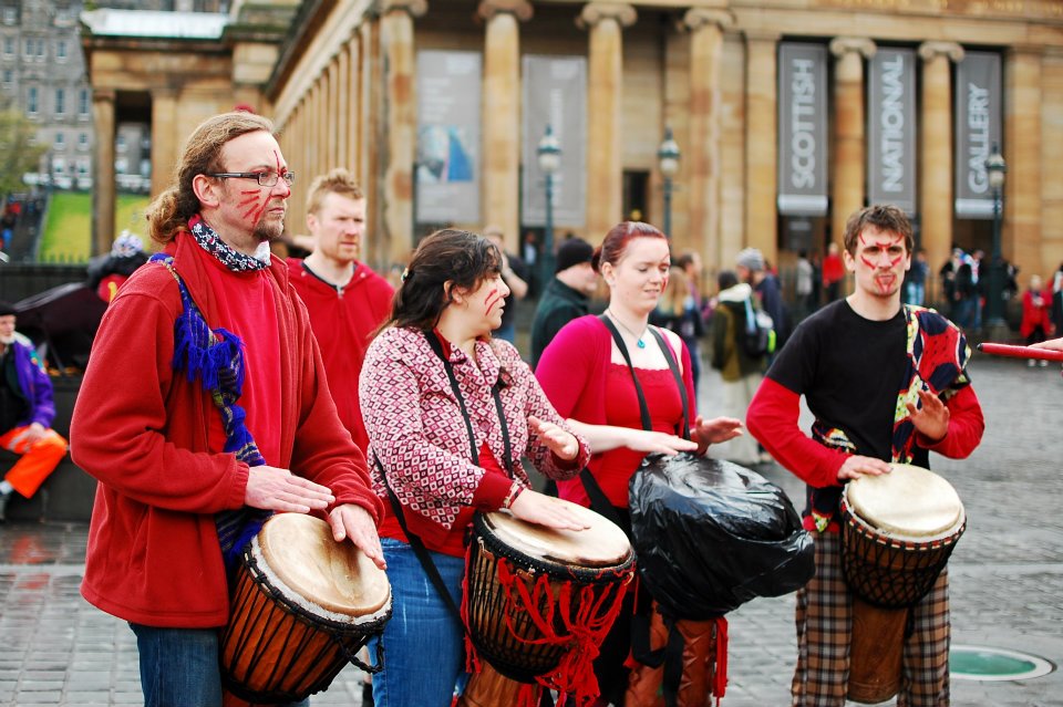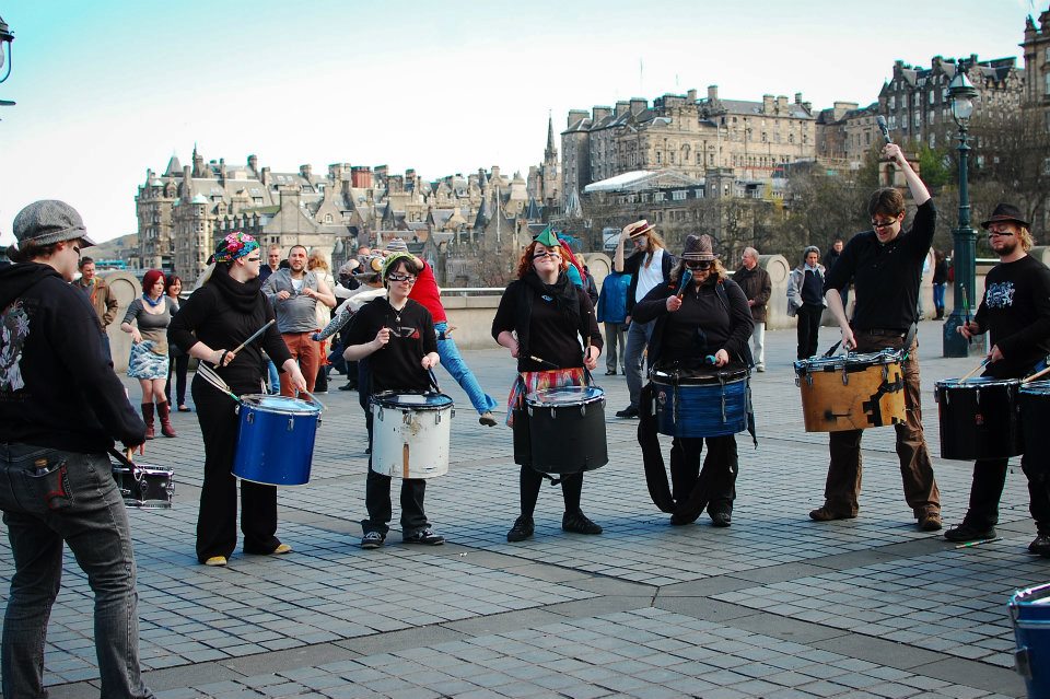Photos from our first busk of the year on The Mound, Edinburgh. Busks help us raise money to fund our events and crowds of locals and tourists alike spent the afternoon watching BFS performers drumming, juggling, acrobalancing, stilt-walking, dancing and err…performing! Even in the pouring rain. Photos by Raini Scott.