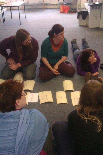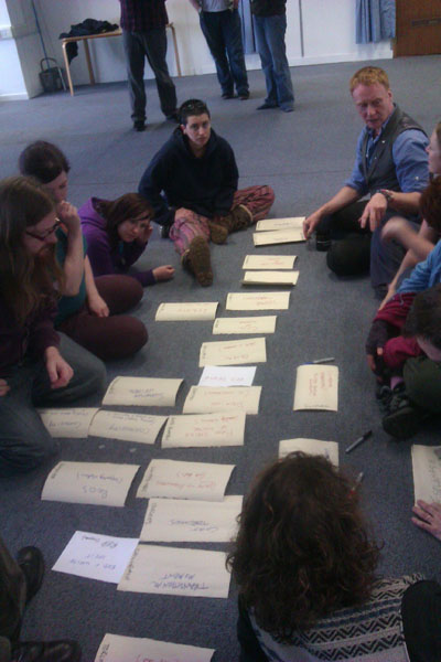The Group Organiser training day is the first time that the GOs for each festival get together. Because every festival is slightly different in terms of the groups involved and the details of the performance, a big part of the GO day is figuring out the storyline for the festival and deciding what happens when. This is the first building block of the festival. It’s hard to believe that in less than two months, we’re going to have a fully planned, exhaustively rehearsed and totally awesome public ritual and celebration of Samhuinn, complete with amazing costumes, polished performances, stunning acrobatics, perfectly timed drumming and super-organised tech and logistics!
