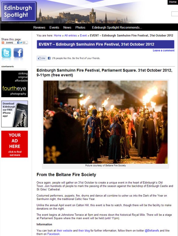 EdinburghSpotlight.com have featured Samhuinn 2012 on their website. It’s always an amazing surprise to receive a “Hey, we’ve written about you!” email and see our events being promoted on the net.