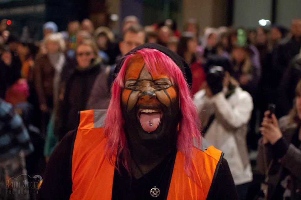 Then the other groups started to arrive, the procession formed up and we started moving! That was when the excitement really kicked in…the realisation that after months of preparation, it was actually happening. Our audience this year was huge and there was such amazing energy with tourists and visitors mingling with local people, many of them in costume and face paint and seemingly most of them either filming or taking pictures.