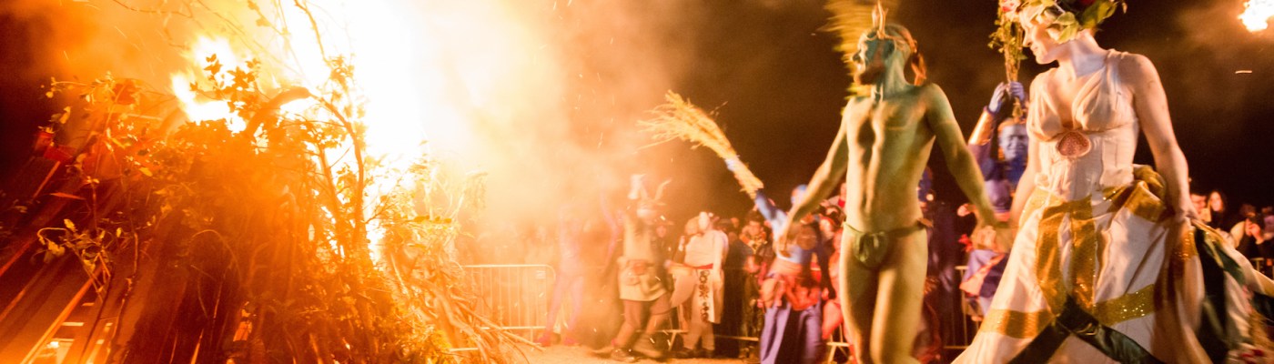 Although Beltane is known as a joyful celebration with fire, a narrative does guide events. Amongst a cavalcade of characters, and set to the beating of the drums, the May Queen leads Her court around Calton Hill to begin the journey toward summer; her counterpart the Green Man is stripped of his winter guise and reborn. Together they light the traditional Beltane bonfire in celebration of the life and warmth ahead in the summer months.