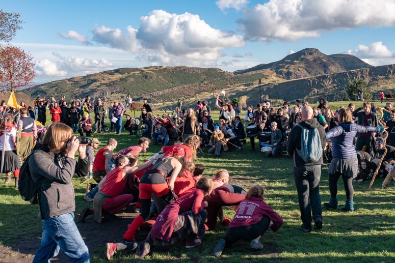 Summer’s Court is still partying when they arrive at the festival on the South side of Calton Hill. They haven’t stopped since Beltane, which kickstarted a glorious season of revelry in the sun, coming together with friends, and celebrating an unexpected heatwave. It may be October, but the Beasties and Reds are in a little bit of denial about the new cold temperatures – they’ll keep up their summery merrymaking until forced to stop.