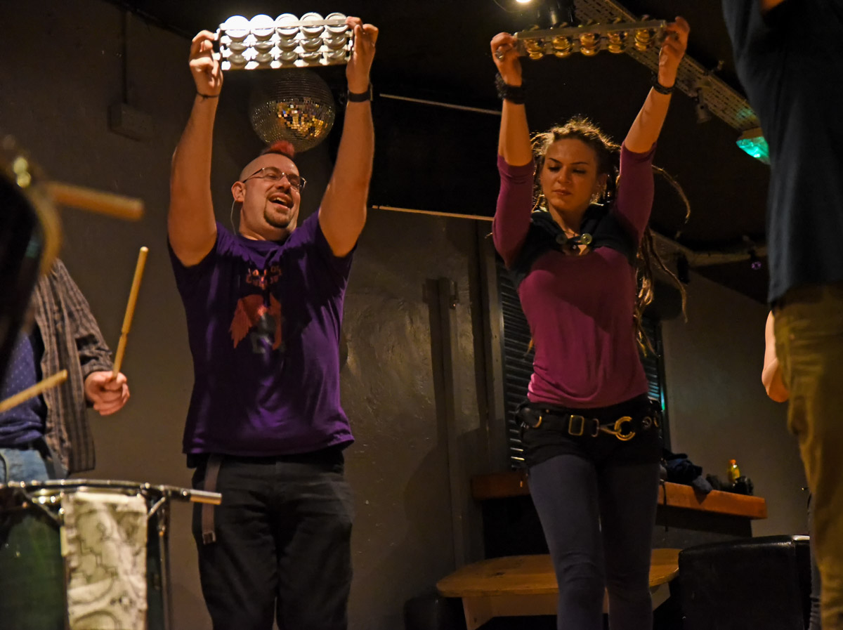 We are always here, we have always been here, and when the boundaries between our world and yours are blurred, you’ll see us. We’ll be the ones partying like there’s no end, the ones who know what has been before, the ones who know all the tricks, the pranks, the music. You’ll see and hear us drumming in the run up to Beltane, but on the night itself, we have so much more in store for you. We have an insane set of pounding rhythms, but that’s not all – with a crew of old hands (and a few talented new ones) we have a variety of skills that have given us a whole bag of tricks to play on audience and performers alike.