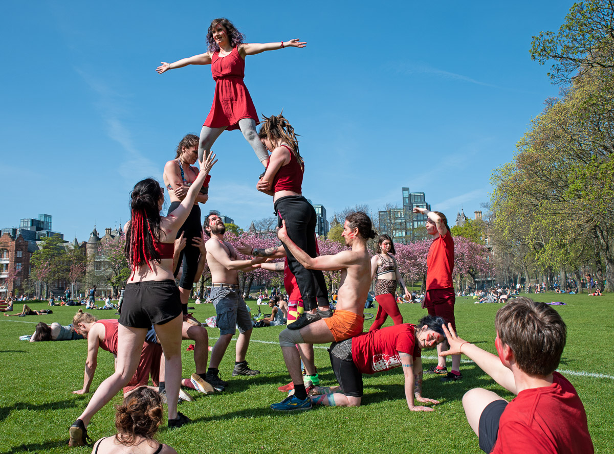 When the May Queen ignites our final bonfire, the Reds mirror the towering blaze by clambering up each other in the form of a pyramid. They are a Red bonfire, creating one of two fiery points that their fellow performers can move between – much like in Beltanes of old, when communities cleansed their flock by driving them between two Neid fires.