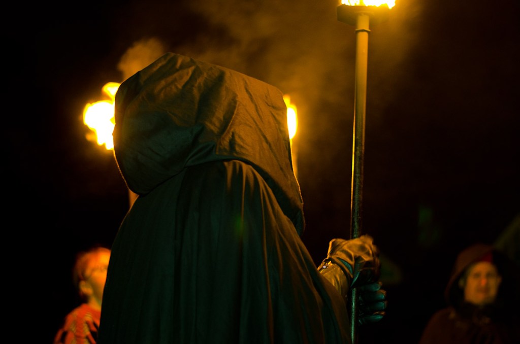 As Nightwatch, the Torchbearers occupy the liminal space, acting as a boundary between the sacred space of the festival and the profane world outside. They are the solemn guardians of the night, circling performance spaces and maintaining a barrier between the otherworldly visitors and their onlookers. They are a wall but also a window, lighting the festival’s rituals for all gathered round to see.