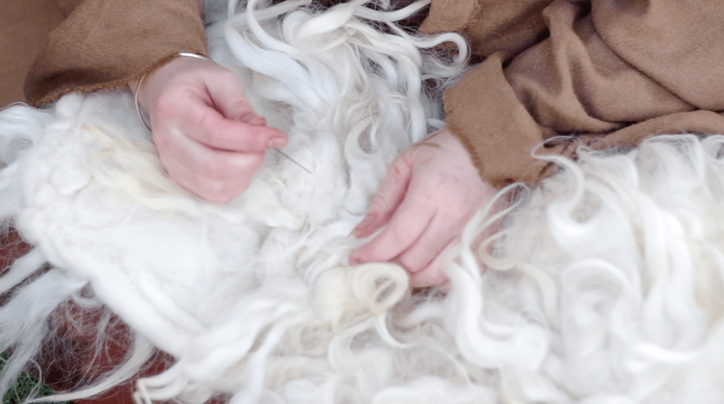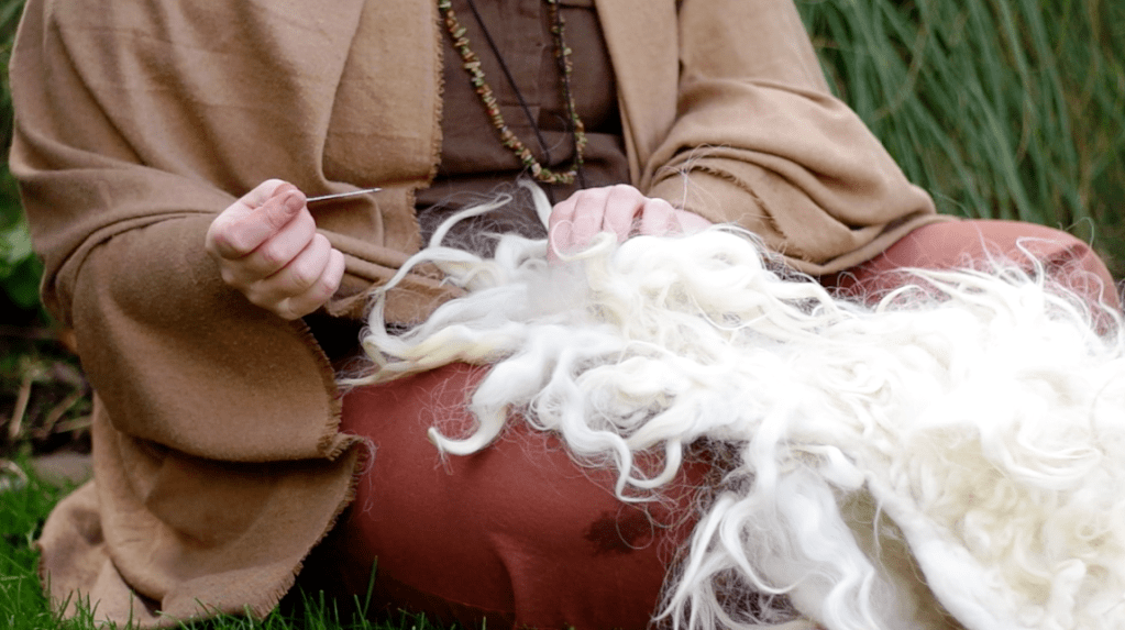 I hand-felted a giant wool collar, the centre-piece of my costume; with it I feel I’m stepping into the shoes of my ancestors. I worked with soft white wool, from Polwarth sheep, and felted long coarse locks from the Greyfaced Dartmoor breed into it. Wearing the collar feels like hefting an entire sheep across my shoulders, although it wriggles less… It lends a kind of bulky stature to one’s shoulders, and is incredibly warm and water resistant.