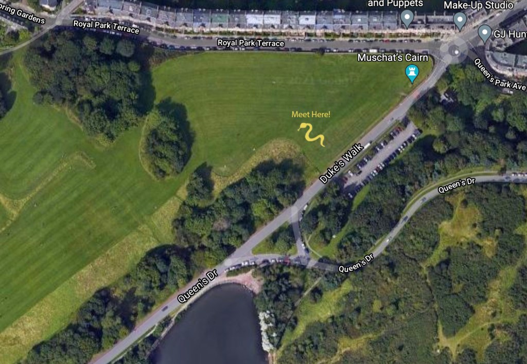 on the grass opposite the car park on Duke’s Road, Holyrood Park.