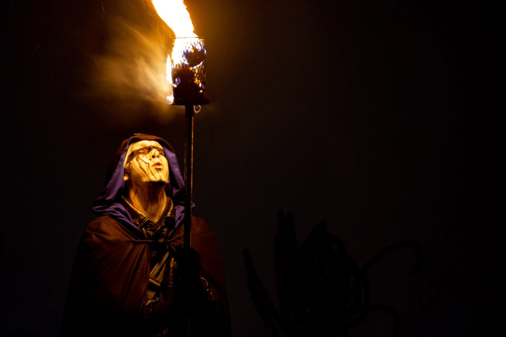 Our stoic Torchbearers are the creators and keepers of the Neid Fire, the natural light that illuminates our whole festival. Donning cloaks and brandishing flaming torches, they march with the procession, lighting the way and illuminating performance spaces. Without them, there would barely be anything to see. Could you be our Leader of Light, our Potentate of Paraffin?