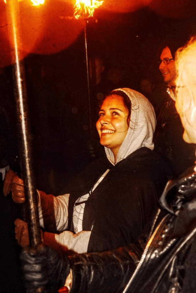 When I arrived at my first Night Watch practice, in that impassioned state often felt by Beltane Fire Society newcomers, I was greeted by a laid-back, leather-clad crowd and was instantly smitten. The scene is forged in my memory: clouds scudding across a blue afternoon sky, my first time on Calton Hill. I perched atop the Portuguese Cannon as I listened to Steve the Blue recount our society’s history–stories he told by heart. We, the newly minted Night Watch, sat enraptured. You would not know if it was our first time hearing these tales or our hundredth. This moment was my most precious as a member of BFS until I was handed my first torch, and, on that darkling night in the Meadows, I felt like a queen being sceptered. Only stepping out onto Canongate on Samhuinn night could have brought me a greater sense of wonder–and it did.