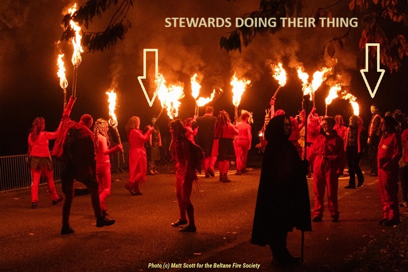 Stewards are one of the first groups to arrive on site. Once gates have opened, we chat to the audience and answer questions. As the start of the performance draws near, we take our places. Many stewards will walk in the procession, making sure neither performers nor audience members catch fire, looking out for sparks and patting them out.