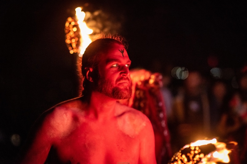 The journey of the Green Man throughout the night will be escaping that state – being drawn out of it by the energy and life of the other groups, culminating in the death and rebirth of the Green Man as a commitment to further growth, and the dance as an expression of that new life.