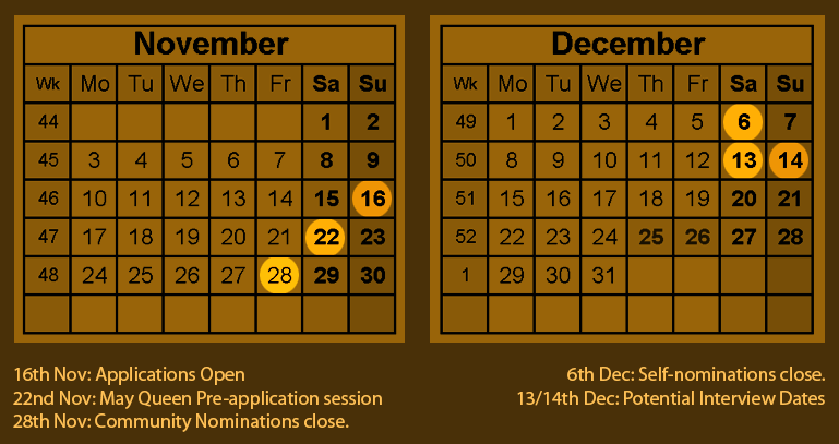 Because text doesn’t always allow for the most free or nuanced of chats, we will be holding an open session on the 22nd of November for potential applicants with the current May Queen and Blues. Attendance is not required at this – it is simply a gently informal space for people to come and learn more about the role or ask questions about things. This will be 10-12 on the morning of the 22nd, at a place to be confirmed. The location of this will probably be released fairly last minute due to waiting on a number of queries but keep an eye on the usual methods of communication.